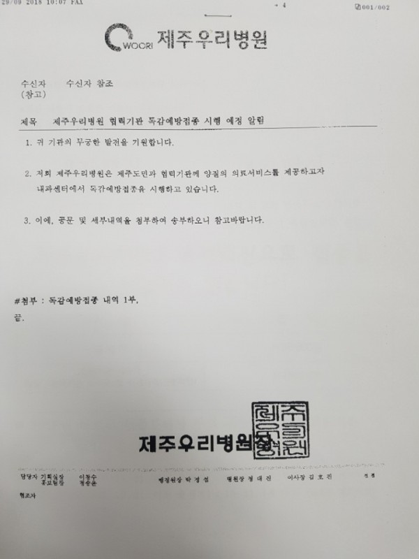 공지사항 보기 제목 제주우리병원 협력기관 독감예방접종 시행 예정 안내 조회수 4,303회 관련링크 본문 제주특별자치도육상연맹과 협력기관인 제주우리병원(前 제주21세기병원) 의 독감예방접종 시행 안내문을 공지합니다. 필요하신분께서는 이용바라며, 제주육상연맹 임원 및 가족, 관계자라 말씀하시면 표기된 금액으로 접종을 받으실수 있으니 참고하시기 바랍니다. 이전글 다음글 목록